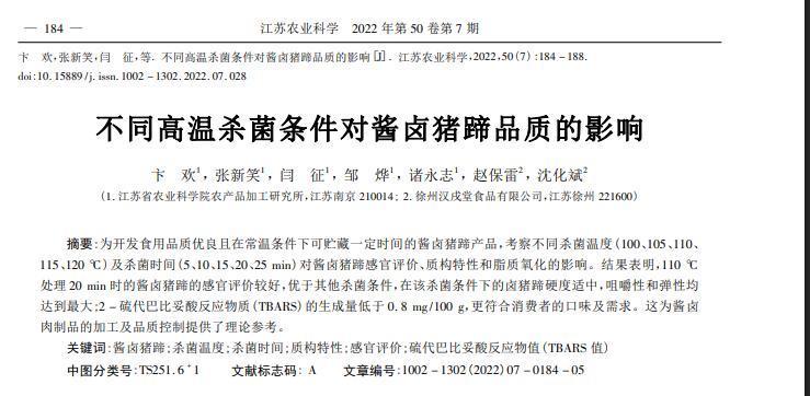 [1]不同高温杀菌条件对酱卤猪蹄品质的影响,卞欢;张新笑,江苏农业科学,2022-04-05